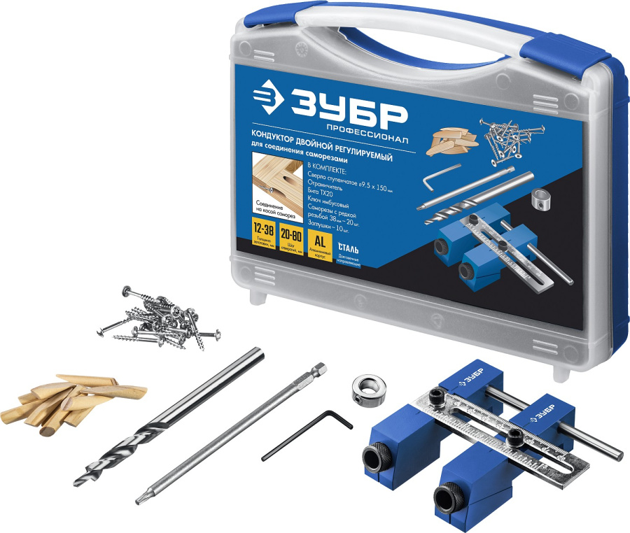 Регулируемый кондуктор ЗУБР «ПРОФЕССИОНАЛ» 30081 предназначен для точного сверления глухих отверстий под углом при соединении деревянных деталей методом скрытого крепежа. Изделие оснащено алюминиевым корпусом с двумя направляющими втулками и позволяет регулировать расстояние между отверстиями в диапазоне 20–80 мм, обеспечивая универсальность при работе с заготовками разной ширины. В комплект входит всё необходимое для начала работы: ступенчатое сверло диаметром 9,5 мм, бита, ограничитель глубины, имбусовый ключ, саморезы и заглушки, упакованные в прочный кейс для удобного хранения и транспортировки.