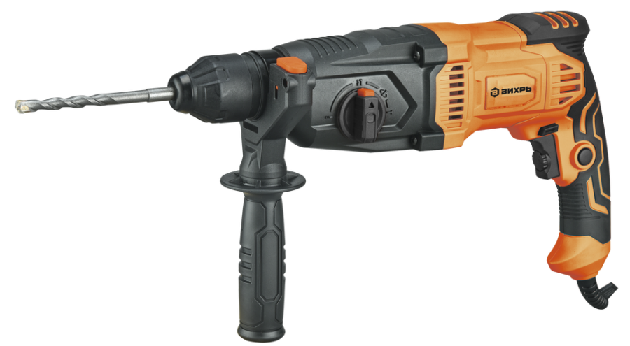 Перфоратор ВИХРЬ – электроинструмент, аналогичный дрели, но с наличием не механического, а пневматического ударного механизма. Именно поэтому перфоратор используют для сложных работ по твёрдым материалам - бетону, кирпичу, металлам. Агрегат используется для сверления и пробивания отверстий в прочных материалах без приложения особых физических усилий со стороны оператора. Принцип работы перфоратора – это разрушение обрабатываемого материала с помощью поступательных и вращательных действий рабочего элемента. Состоит перфоратор из электрического двигателя, редуктора, ударного механизма и патрона для крепления рабочих инструментов (буры, коронки, зубила и т.д.).