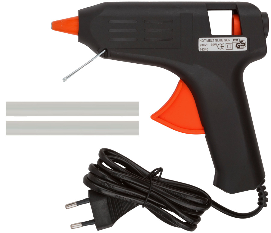 220 В. Для склеивания дерева, бумаги, ДСП, линолеума и пластика. Используется с клеевым стержнем. Противокапельная система. Материал: пластиковый корпус, инструментальная сталь, ПВХ. Упаковка: блистер.