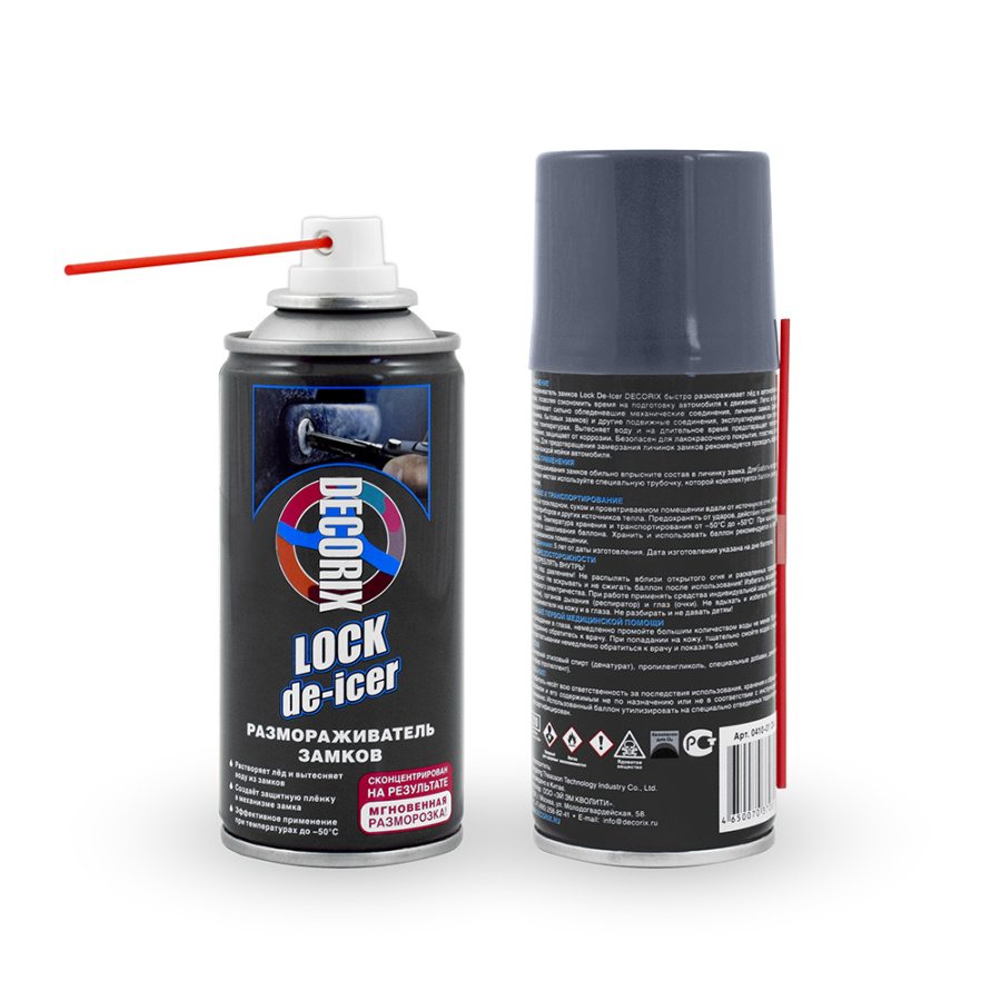 Аэрозольный размораживатель замков Decorix 210 мл 0410-01 DA быстро размораживает лёд в автомобильных замках, позволяя сэкономить время на подготовку автомобиля к движению. Легко и быстро размораживает сильно обледеневшие механические соединения, личинки замков (дверей, багажника, бытовых замков) и другие подвижные соединения, эксплуатируемые при отрицательных температурах. Вытесняет воду и на длительное время предотвращает повторное замерзание, защищает от коррозии. Безопасен для лакокрасочного покрытия, пластика, хрома и резины. Для предотвращения замерзания личинок замков рекомендуется проводить обработку после каждой мойки автомобиля.