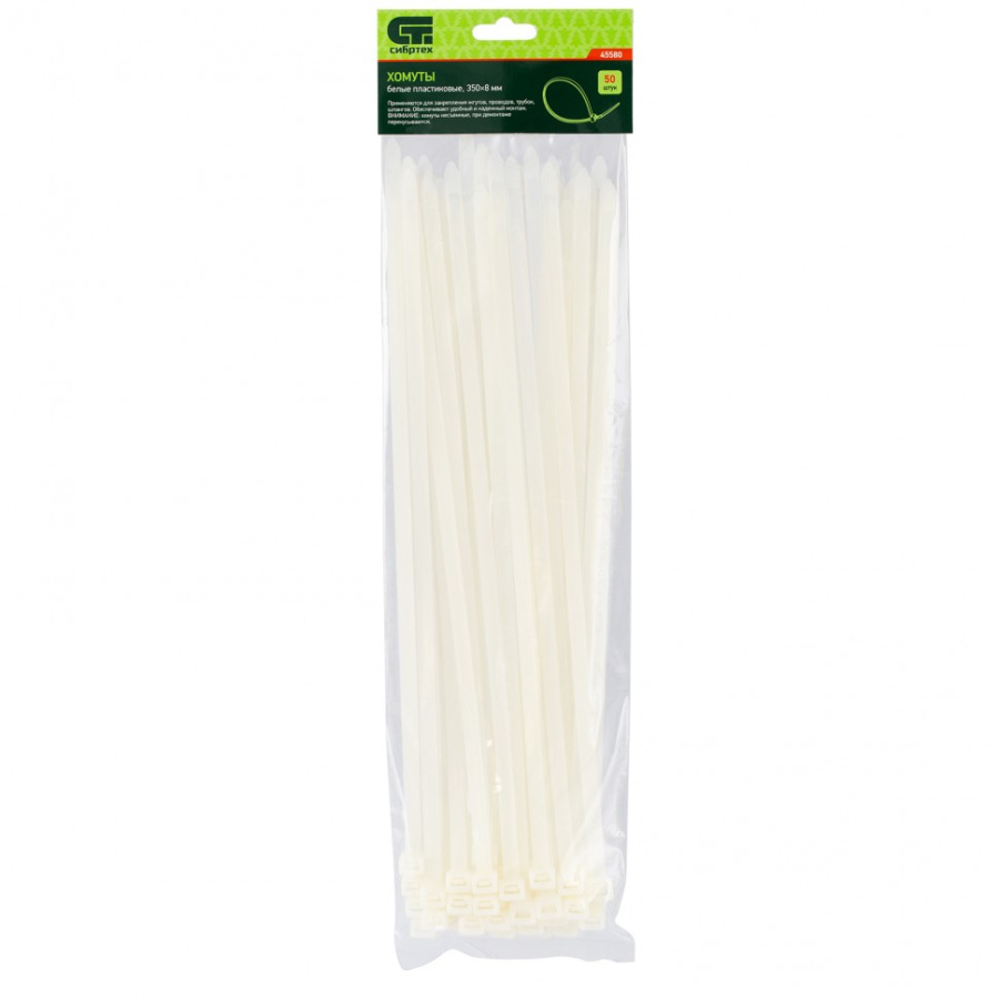 Хомуты, 350 х 8 мм, пластиковые, белые, 50 шт Сибртех 45580