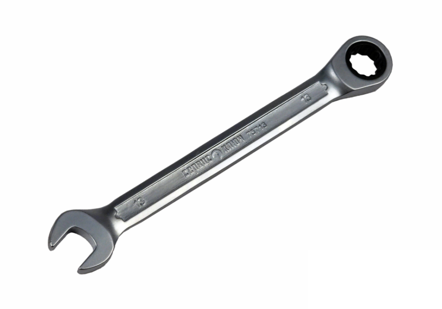 Комбинированный трещоточный ключ 13 мм: рожковый профиль + 12-гранный накидной зев с механизмом 38 зубов (угол 9,5°). Хром-ванадиевая сталь (CrV), холодный штамп 46–50 HRC, матовое антикоррозийное покрытие. Для работы с крепежом в трудодоступных местах.