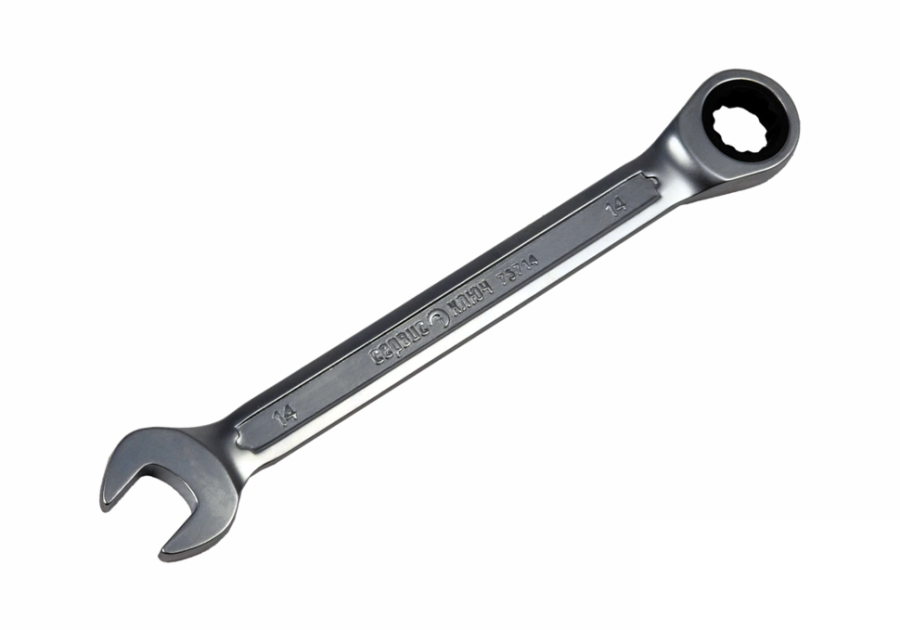 Комбинированный трещоточный ключ 14 мм: рожковый профиль + 12-гранный накидной зев с механизмом 38 зубов (угол 9,5°). Хром-ванадиевая сталь (CrV), холодный штамп 46–50 HRC, матовое антикоррозийное покрытие. Для работы с крепежом в трудодоступных местах.