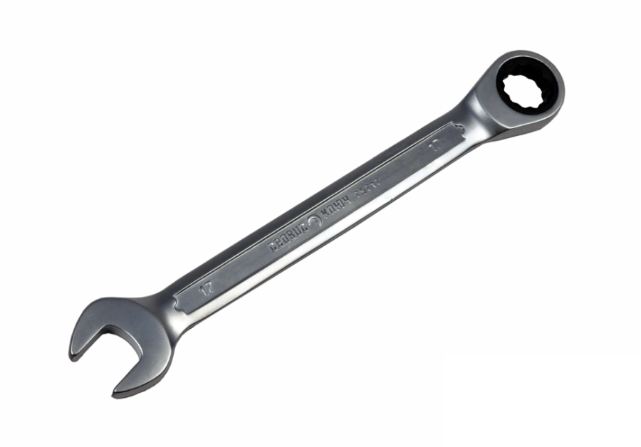 Комбинированный трещоточный ключ 17 мм: рожковый профиль + 12-гранный накидной зев с механизмом 38 зубов (угол 9,5°). Хром-ванадиевая сталь (CrV), холодный штамп 46–50 HRC, матовое антикоррозийное покрытие. Для работы с крепежом в трудодоступных местах.