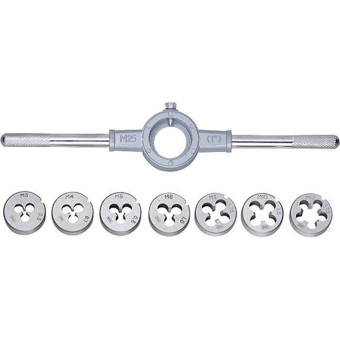 Плашки: М3 x 0.5 мм, М4 x 0.7 мм, М5 x 0.8 мм, М6 x 1 мм, М8 x 1.25 мм, М10 x 1.5 мм, М12 x 1.75 мм.