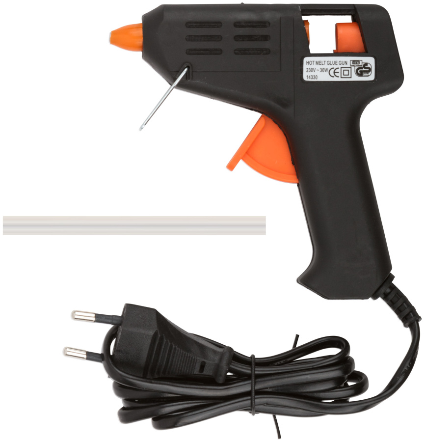 220 В. Для склеивания дерева, бумаги, ДСП, линолеума и пластика. Используется с клеевым стержнем. Противокапельная система. Материал: пластиковый корпус, инструментальная сталь, ПВХ. Упаковка: блистер.