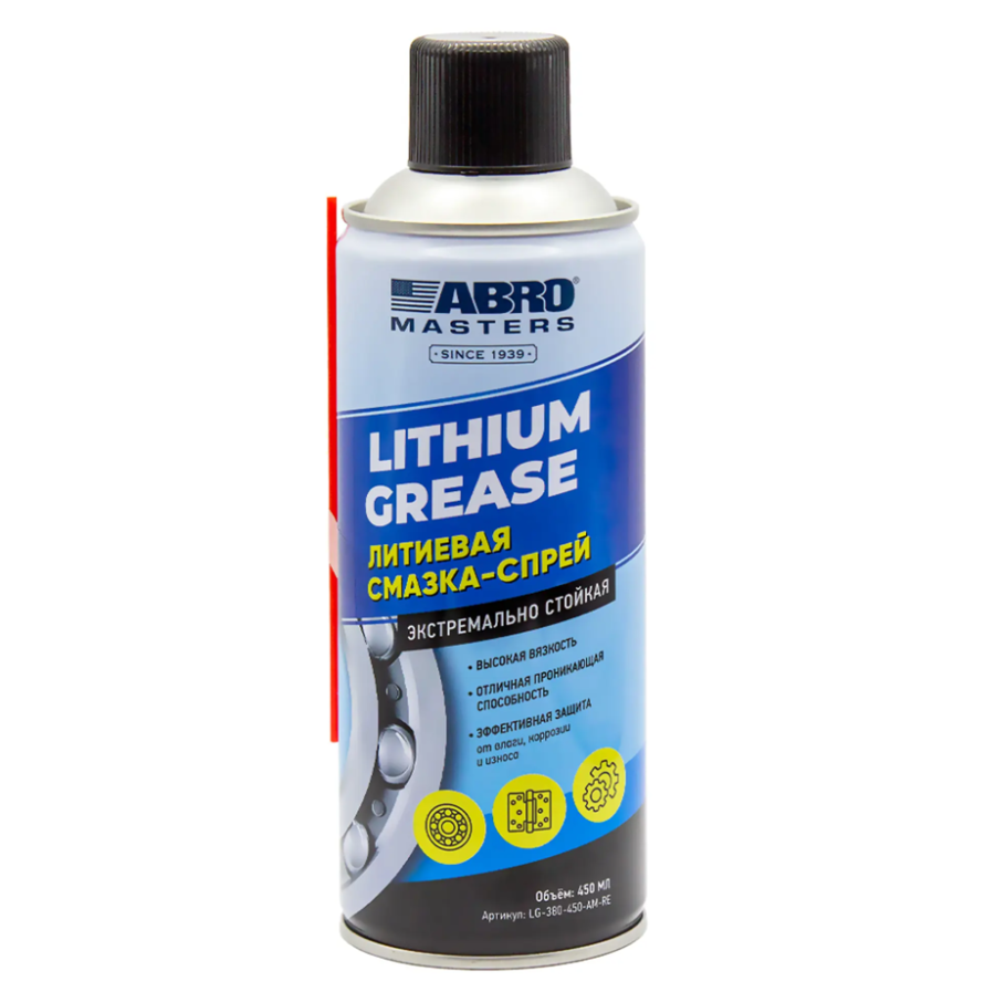 Смазка-спрей литиевая ABRO MASTERS LG-380-450-AM-RE (450 мл) — многофункциональная смазка на литиевой основе для обработки соединений металл-металл, обеспечивающая отличную адгезию, водостойкость и защиту от коррозии.