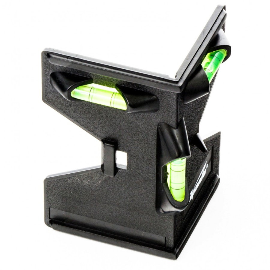 Многофункциональный уровень изготовлен из ударопрочной пластмассы. Имеет угловую форму, позволяющую производить измерения под разными углами на различных поверхностях. Имеет три цилиндрических глазка.
