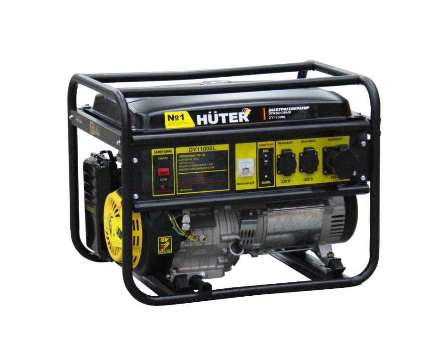 Бензиновый генератор Huter DY11000L – портативная компактная электростанция, обеспечивающая электроснабжение бытовой техники и профессионального оборудования, питающегося от стандартной однофазной сети 220 Вольт. Это самый выгодный бензиновый электрогенератор, с оптимальными техническими характеристиками и низким расходом топлива.Модель DY11000L может использоваться в качестве резервного источника питания для частных домов и квартир, а также как постоянная станция, обеспечивающая работу электроприборов в полевых условиях. Генерирующая установка имеет синхронный тип устройства и щёточный механизм.Комплектация:Бензиновый электрогенератор.Силовая вилка 32 АСвечной ключ. Вороток либо отвёртка (в зависимости от модели)Комплект резиновых опор с гайкамиПаспорт (руководство по эксплуатации)Бензиновая электростанция Huter DY11000L оборудована мощным одноцилиндровым четырёхтактным двигателем внутреннего сгорания, мощностью 19 л.с. Запуск производится ручным стартером. Для удобства транспортировки, отдельно можно приобр