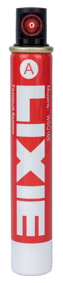 Газовый баллон LIXIE красный клапан А WSQ165A для монтажных пистолетов LIXIE. Основной топливный элемент для газовых гвоздезабивных инструментов. Позволяет забить от 1000 до 1400 гвоздей с одного баллона. Специальная смесь сжиженного газа и лубрикантов позволяет продолжительно использовать инструмент без смазки основных узлов.