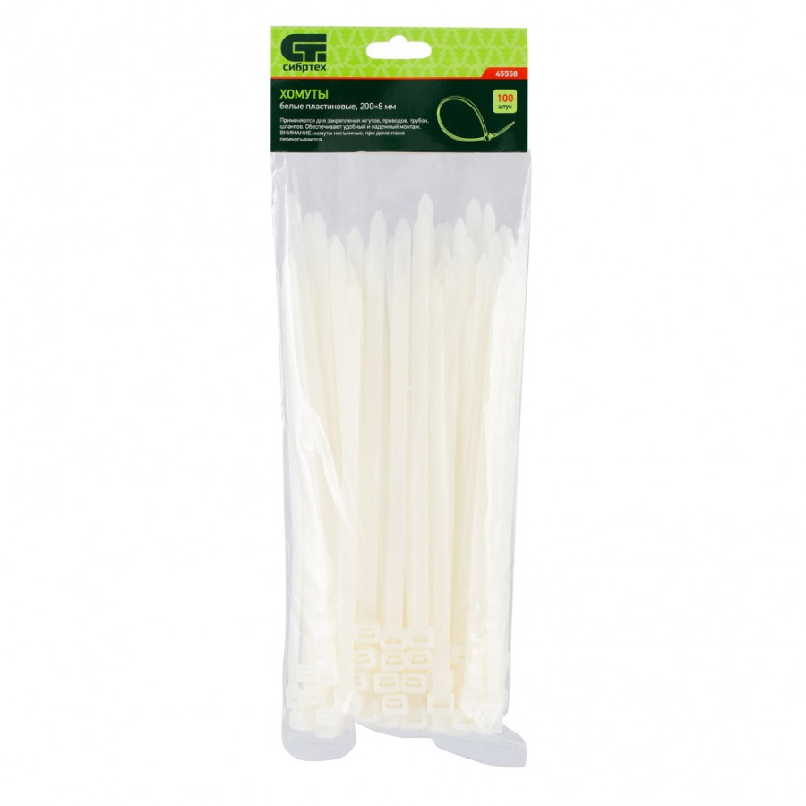 Хомуты, 200 х 8 мм, пластиковые, белые, 100 шт Сибртех 45558