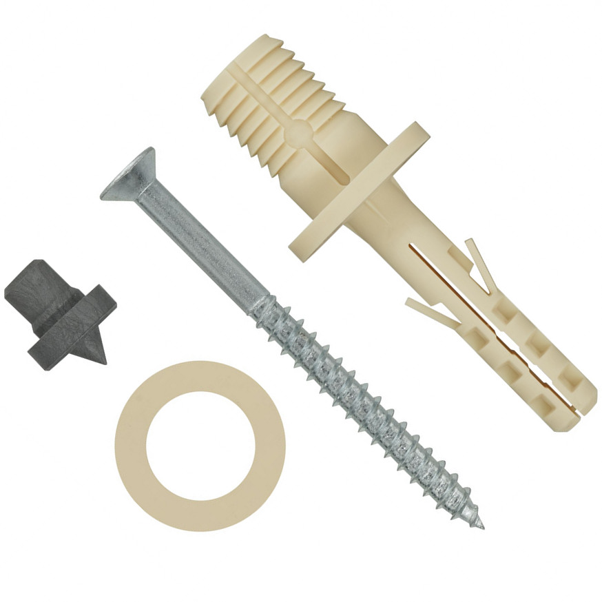 Состав комплекта PLB: распорный нейлоновый дюбель, шайба регулировочная, шуруп оцинкованный ГОСТ 1145-80, разметочный керн.