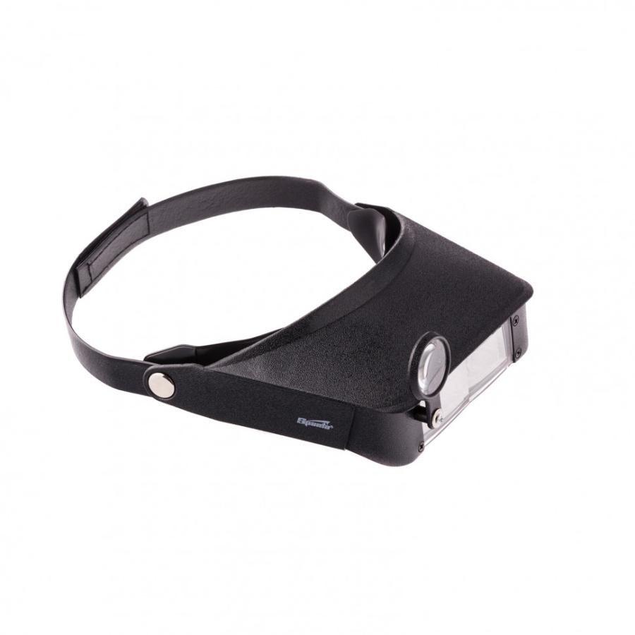 Удобная и практичная лупа в пластиковом корпусе, закрепляемая на голове с помощью изменяемого по размеру обода.