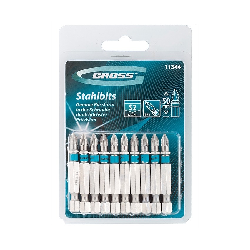 Биты применяются в качестве насадок для ручного и механического иструмента.Основу биты составляет шестигранный хвостовик размером 0,6 см (1/4 дюйма).Длина биты 50 мм, тип шлица - PZ1 (крестообразный с дополнительными направляющими).В качестве защиты от контрафакта на каждой бите присутствует цветное кольцо с логотипом торговой марки GROSS.Набор из десяти бит упакован в жесткую термоформованную пленочную коробку (double blister) размером 125 Х 85 мм.ОсобенностиСталь S2