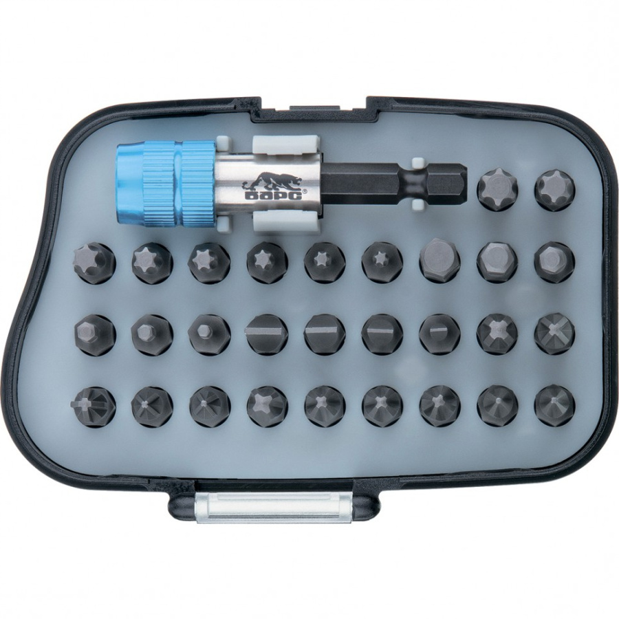Набор бит из S2 стали. В комплект входят: биты с профилем PH1•2, PH2•3, PH3, PZ1•2, PZ2•2, PZ3, SL3, SL4.5, SL5.5, SL6.5, T9, T10, T15, T20, T25, T27, T30, T40, H2, H2.5, H3, H4, H5, H6.Твердость бит: 60 HRC.