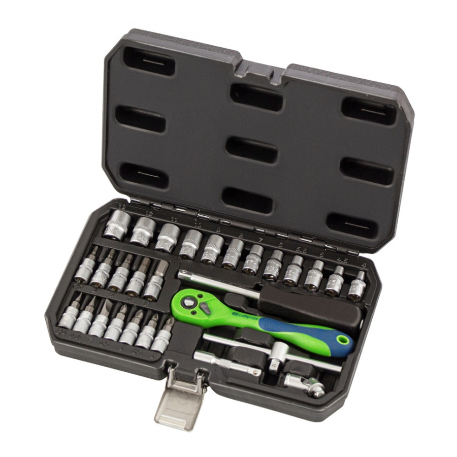Разработан специально для автолюбителей, предназначен для ремонта машины в гараже. Может использоваться для выполнения несложных бытовых работ. Элементы набора изготовлены из CrV стали, обеспечивающей исключительную прочность, и имеют антикоррозийное матовое покрытие. Трещоточный ключ оснащен специальным переключателем с насечкой, что позволяет удобно работать одной рукой. Набор упакован в кейс, изготовленный из прочного противоударного пластика. Надежные металлические замки.