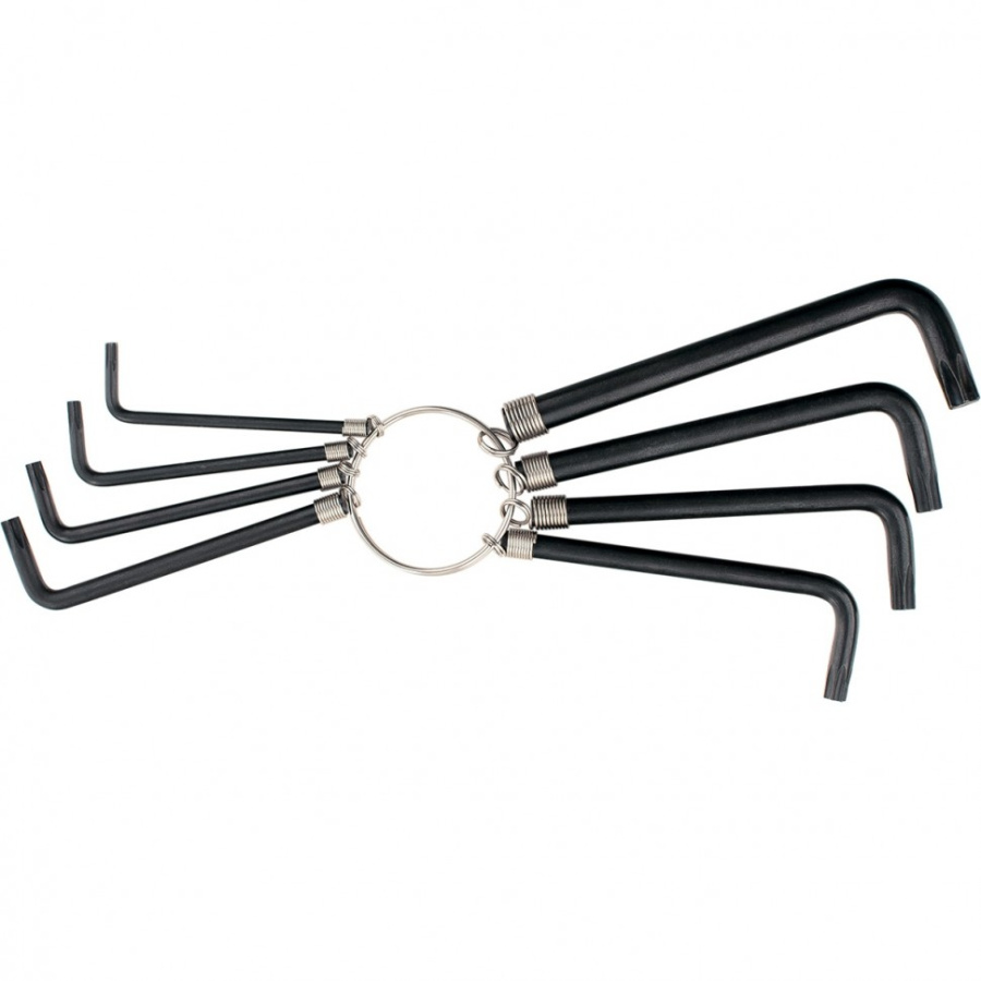 Набор имбусовых ключей c профилем Torxпредназначен для монтажа и демонтажа резьбовых соединений. Ключи изготовлены из углеродистой стали, оксидированы. Твердость рабочей части — 45 HRС. Для удобства хранения ключи закреплены на кольце. Состав набора: T10,15,20,25,27,30,40,45,50.