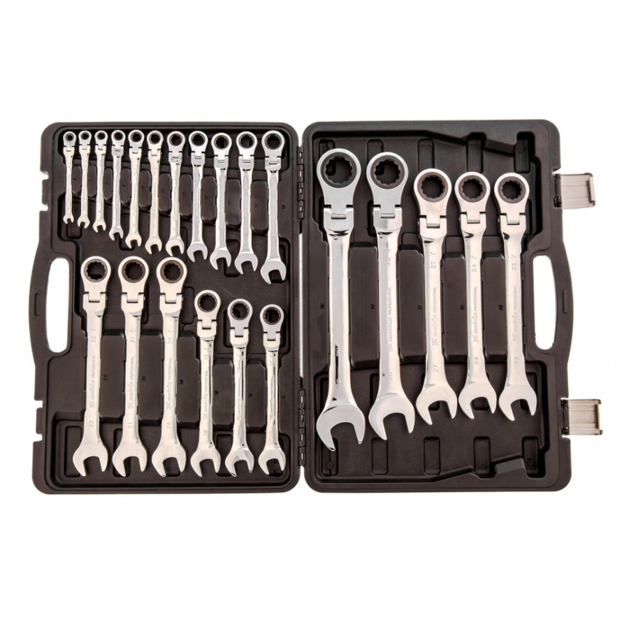 Ключ гаечный комбинированный с трещоткой и шарниром предназначен для эффективного откручивания или закручивания болтовых соединений в труднодоступных местах. Наличие шарнира позволяет менять угол наклона ключа относительно его рабочей накидной части (0–180 градусов).