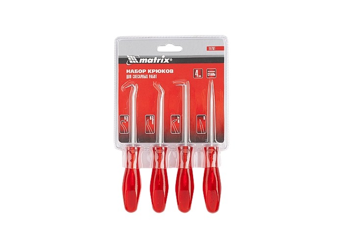 Набор, состоящий из крюков и шила Matrix прекрасно подходит для осуществления разметки металлических деталей, работы с уплотнительными шайбами, кольцами, сальниками и т.д. прокалывания отверстий. Набор является незаменимым при выполнении ремонта и обслуживания оборудования и машин, а также при слесарных работах.Состав набора: Полный крюк, Угловой крюк, крюк 90 градусов, Шило.