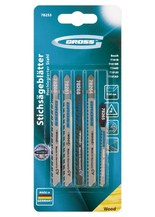 Полотна для электролобзика торговой марки GROSS изготовлены из высококачественной немецкой хромованадиевой стали и относятся к линейке профессионального инструмента. Отличительные особенности этой линейки: стойкость к изнашиванию, более высокая твердость по сравнению с обычными полотнами. При изготовлении полотен применяется лазерный раскрой профиля, процесс заточки и шлифовки полностью автоматизирован. Используются полотна в качестве режущего инструмента для распиловки изделий из твердой и мягкой древесины, фанеры, ламинированного ДВП и пластмассы. Полотна длиной 100 мм с шагом зуба 10 TPI прекрасно справляется с материалом толщиной от 4 до 60 мм. Набор упакован в жесткую термоформованную пленочную коробку (double blister).
