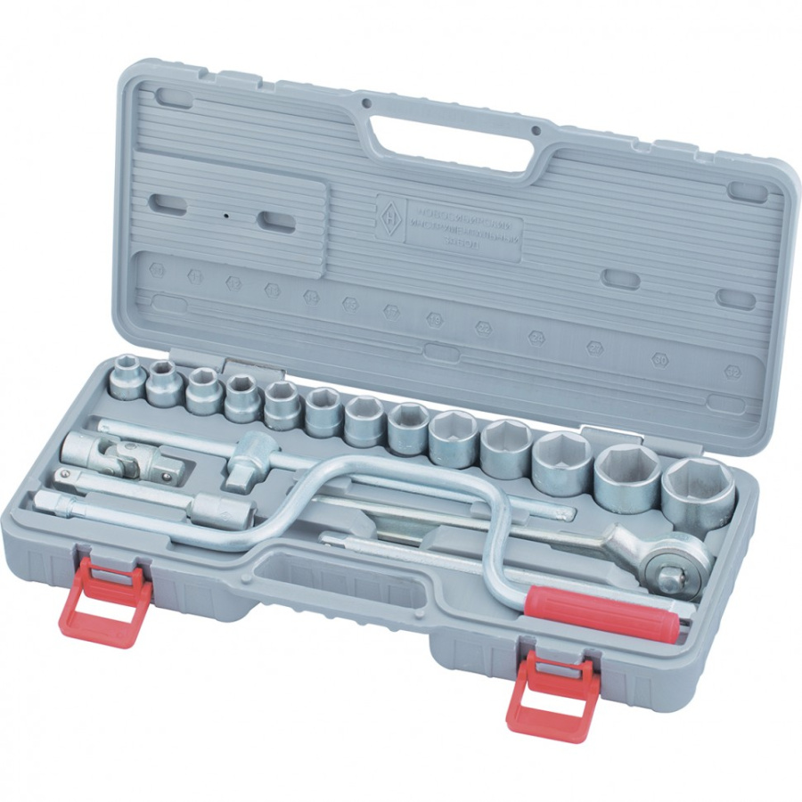 Все инструменты изготовлены из инструментальной стали 40Х и оцинкованы. В комплект входят: трещоточный ключ, ключ с присоединительным квадратом, удлинители 125 и 150 мм, коловорот, шарнир, торцевые головки 10, 11, 12, 13, 14, 15, 17, 19, 22, 24, 27, 30 и 32 мм.