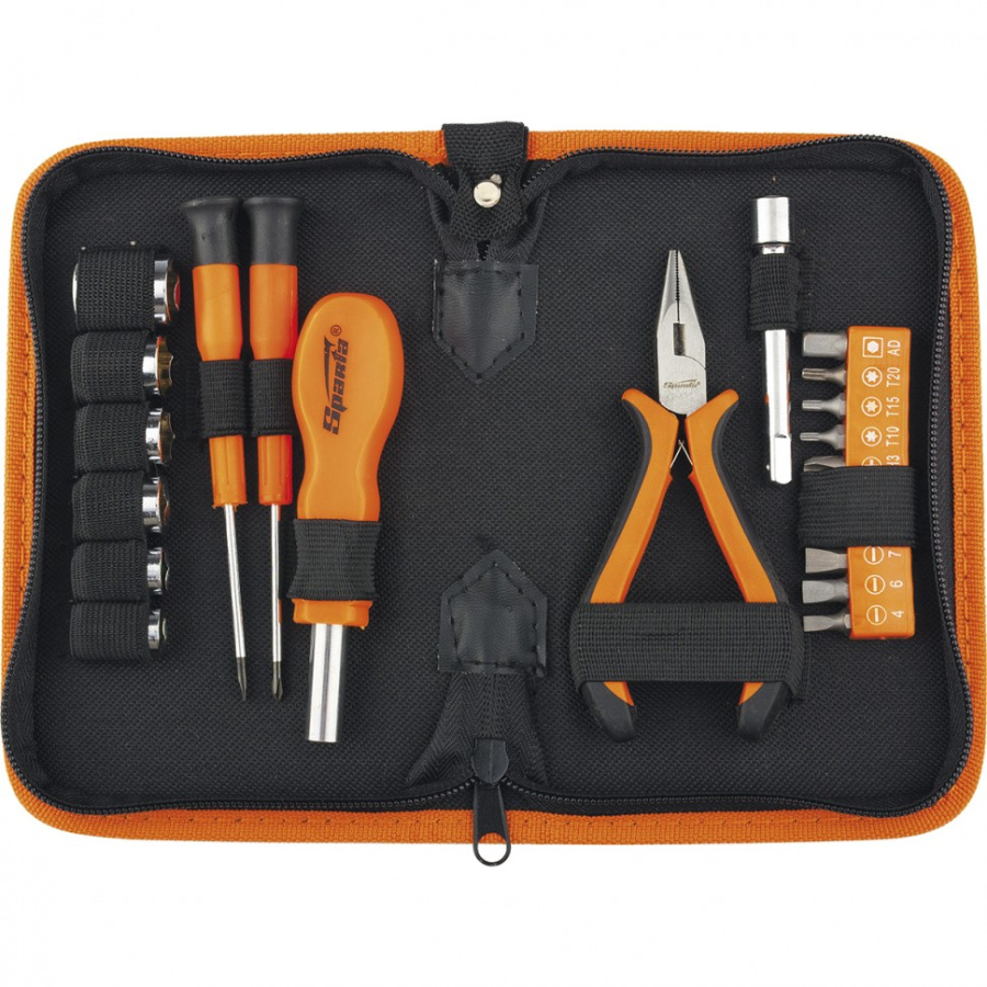 Набор инструментов из 22 предметов. В комплект входят длинногубцы, отвертка, переходник, удлинитель, две часовые отвертки, торцевые головки 8, 9, 10, 11, 12, 13, 14 мм и биты PH 1, PH 2, PZ 1, PZ 2, SL 5, SL 6, T 10, T 15, T 20.