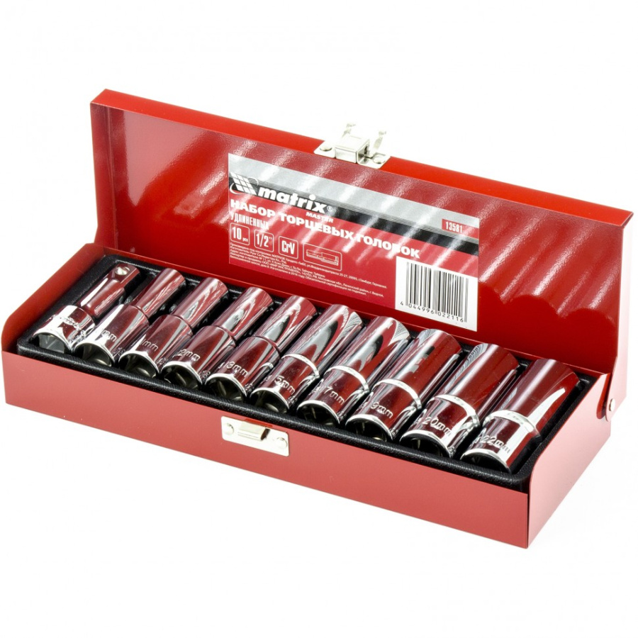 Набор торцевых головок, квадрат 1/2, головки 10-22 мм, удлиненные, 10 предметов Matrix Master 13581