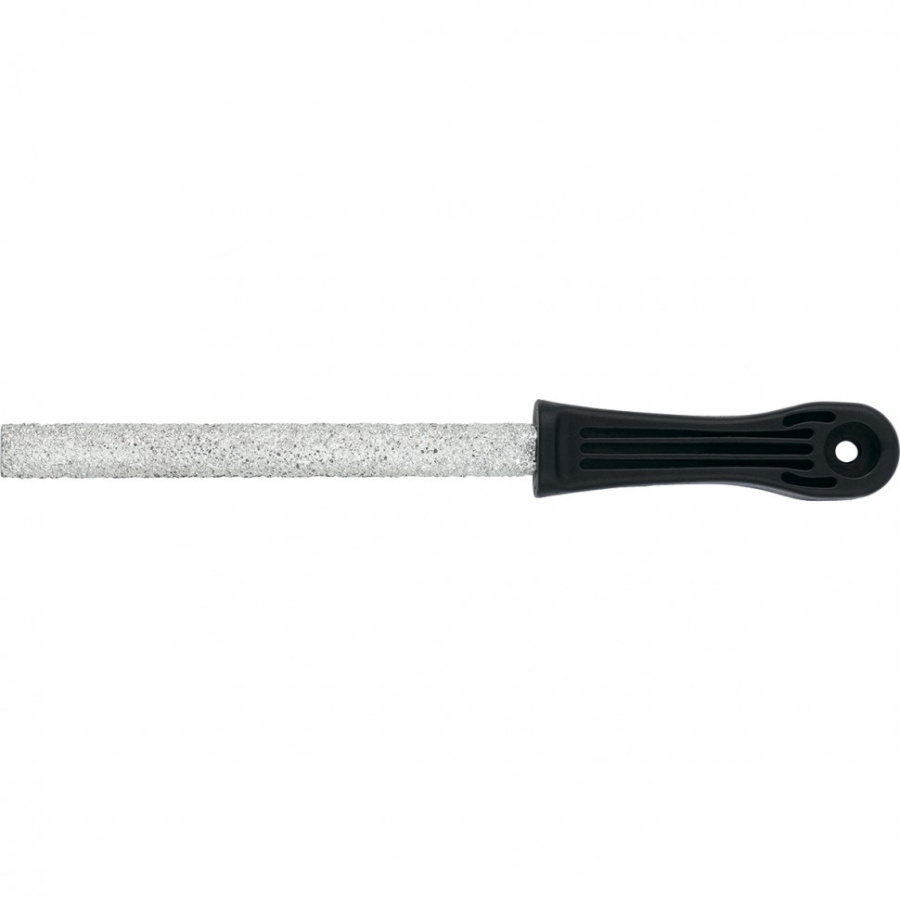 Напильник предназначен для обработки плоских поверхностей и круглых отверстий в особо твердых материалах. Напильник изготовлен из углеродистой стали и имеет специальное карбидное напыление. Поставляется в комплекте с эргономичной полипропиленовой рукояткой, покрытой мягким эластомером.