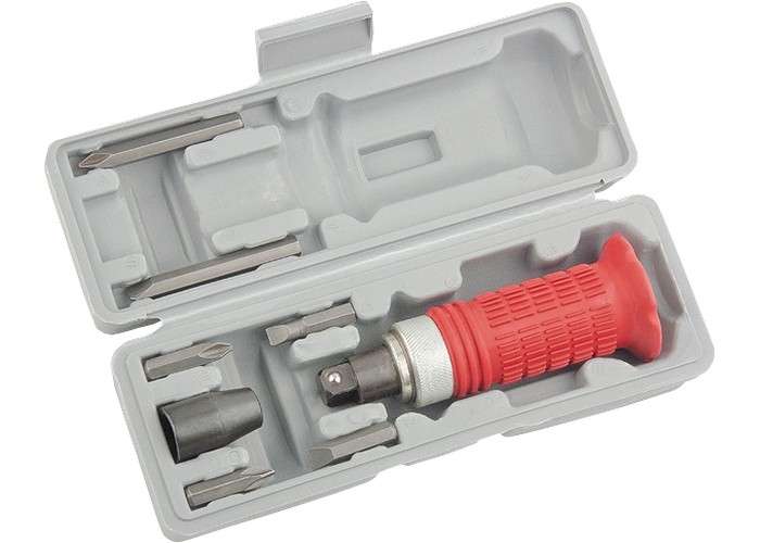 Отвертка имеет обрезиненную рукоятку с протектором, оснащена ударными битами SL – 7 x 35, 8 x 35, 8 x 65 мм