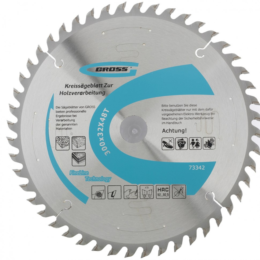 Пильный диск по дереву торговой марки GROSS предназначен для распиловки заготовок из мягких и твердых пород древесины, фанеры, ДСП. Изготовлен пильный диск из пружинной стали марки 65MN. Размеры диска 300 х 32 мм. Форма зуба (ATB) с положительным углом наклона обеспечивает эффективную распиловку крупных заготовок. 48 режущих пластин изготовленных из твердого сплава, произведенного компанией CERATIZIT (Люксембург), и обладают исключительной стойкостью к окислению, истиранию и разрушению. Пайка пластины к диску осуществляется припоем с высоким содержанием серебра, гарантируя тем самым высокую надежность крепления.