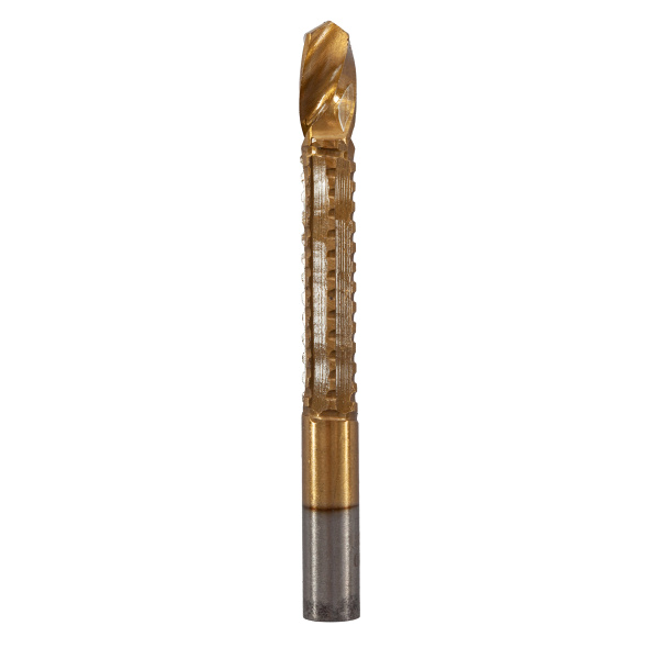 Инструментальная легированная сталь, нитрид-титановое покрытие. Для сверления с последующим фрезерованием листовых материалов.