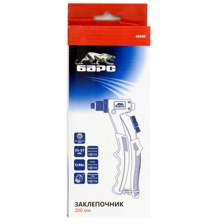 Заклепочник 200 мм, алюминий 2.4-4.8 мм, сталь 2.4-4 мм Барс 40430